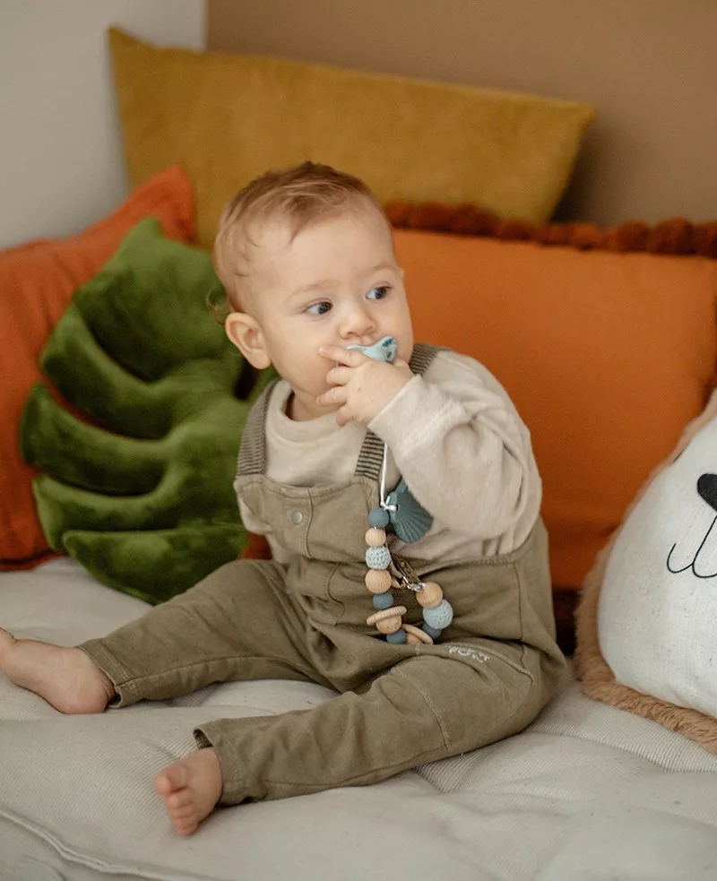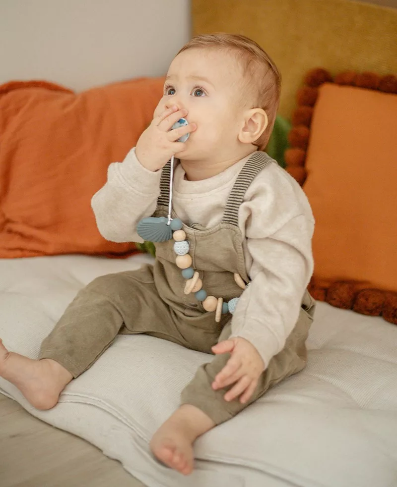 A Label Label stílusos cumilánc a megoldás, hogy a gyermeke el ne veszítse a cumit! És persze ezzel a cumizsinórral megakadályozhatod, hogy a cumi beszennyeződjön, ha esetleg leesik. Ez a szép cumicsipesz gyönyörű fa és kék színű gyöngyökkel és egy aranyos, kagyló formájú rágóka játékkal rendelkezik.