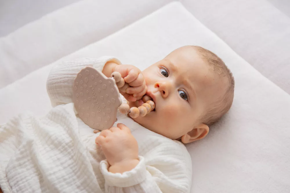 A rágóka kialakítása a pici kezek számára is ideális. A baba könnyen megragadhatja, és forgathatja a kezében. A többféle módon textúrált felület, és a kíméletes szilikon együttes alkalmazása, maszírozza a baba fogínyét, így enyhítve a fogzás idején fellépő fájdalmat, és kellemetlenségeket.
