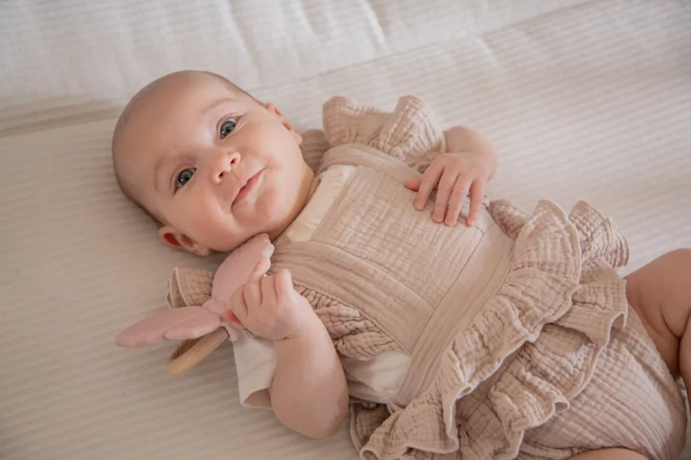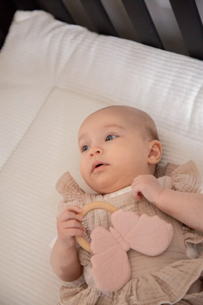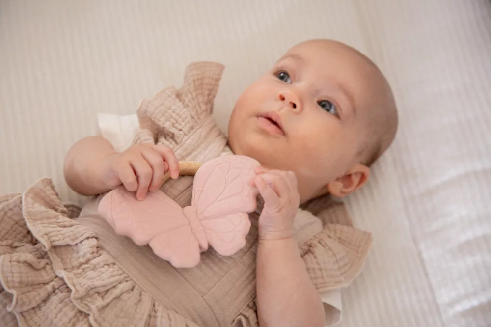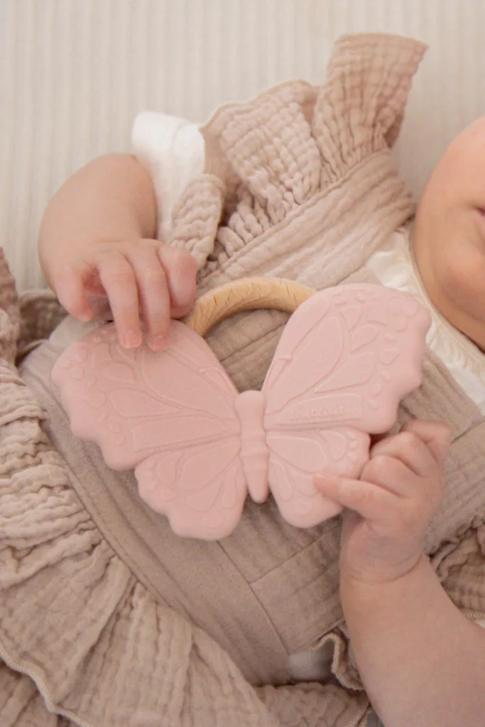 A rózsaszín pillangó alakú rágóka kialakítása a pici kezek számára is ideális. A baba könnyen megragadhatja, és forgathatja a kezében. A többféle módon textúrált felület, és a kíméletes szilikon együttes alkalmazása, maszírozza a baba fogínyét, így enyhítve a fogzás idején fellépő fájdalmat, és kellemetlenségeket.