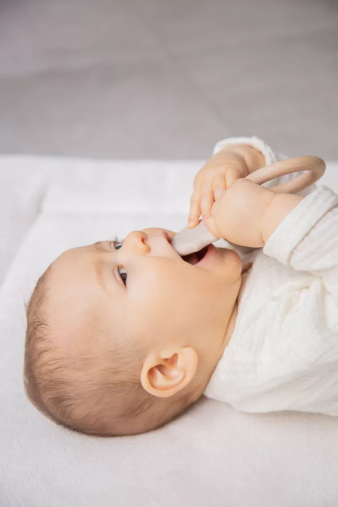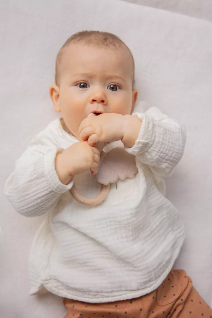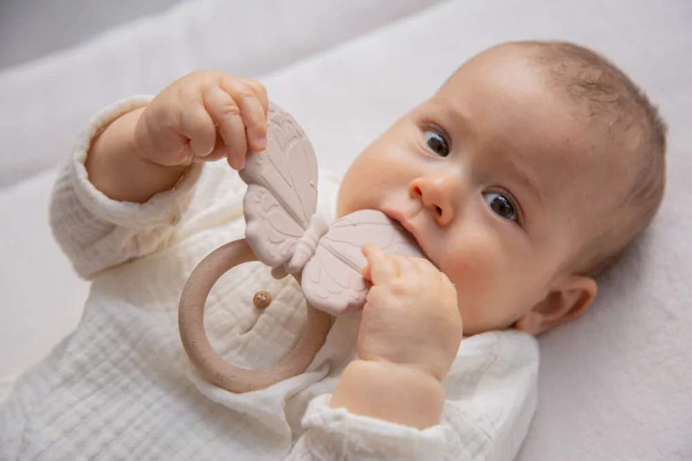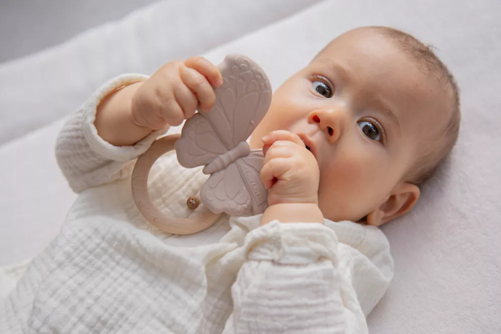 A nugát színű pillangó alakú rágóka kialakítása a pici kezek számára is ideális. A baba könnyen megragadhatja, és forgathatja a kezében. A többféle módon textúrált felület, és a kíméletes szilikon együttes alkalmazása, maszírozza a baba fogínyét, így enyhítve a fogzás idején fellépő fájdalmat, és kellemetlenségeket.