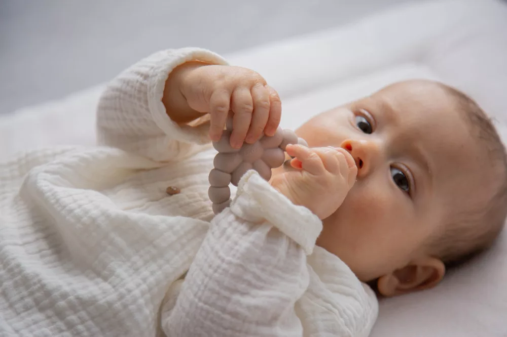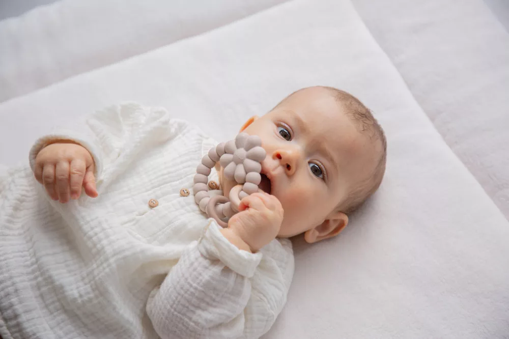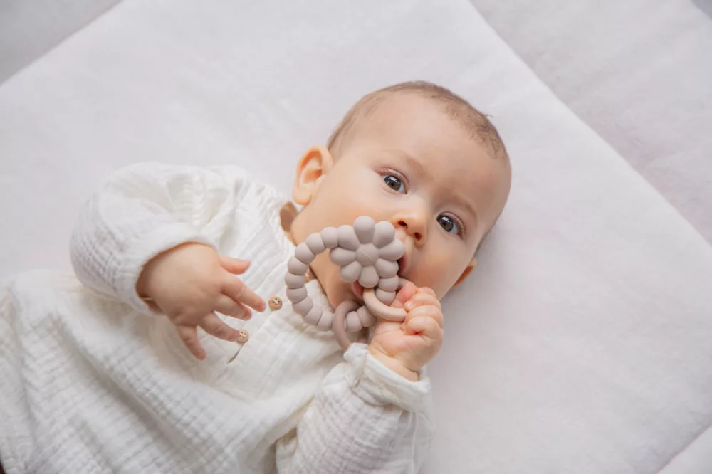 A nugát színű virág alakú rágóka kialakítása a pici kezek számára is ideális. A baba könnyen megragadhatja, és forgathatja a kezében. A többféle módon textúrált felület, és a kíméletes szilikon együttes alkalmazása, maszírozza a baba fogínyét, így enyhítve a fogzás idején fellépő fájdalmat, és kellemetlenségeket.