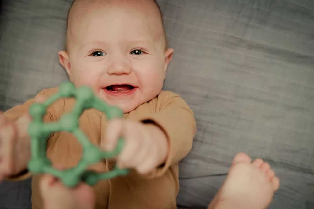 A labda rágóka kialakítása a pici kezek számára is ideális. A baba könnyen megragadhatja, és forgathatja a kezében. A többféle módon textúrált felület, és a kíméletes szilikon együttes alkalmazása, maszírozza a baba fogínyét, így enyhítve a fogzás idején fellépő fájdalmat, és kellemetlenségeket.