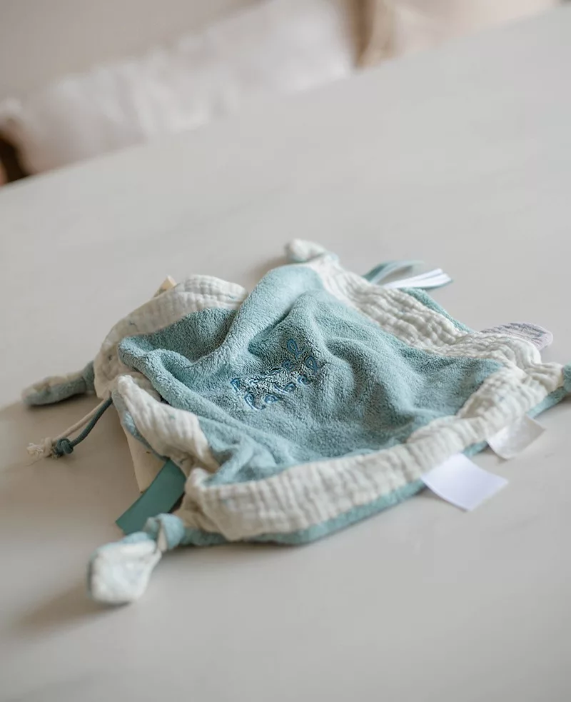 Újrahasznosított és organikus anyagokból készült szundikendők a kollekciónkban. Az egyik oldala újrahasznosított puha bújós plüssből, a másik oldala bio muszlinból készült. Annak érdekében, hogy a kicsi figyelmét még jobban felkeltse vagy épp megnyugodjon, számos különböző textúrájú címkét adtak hozzá.