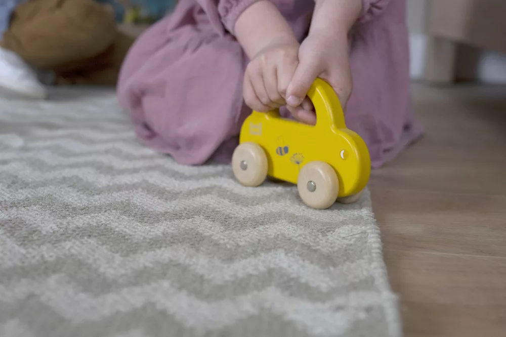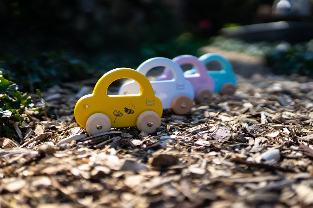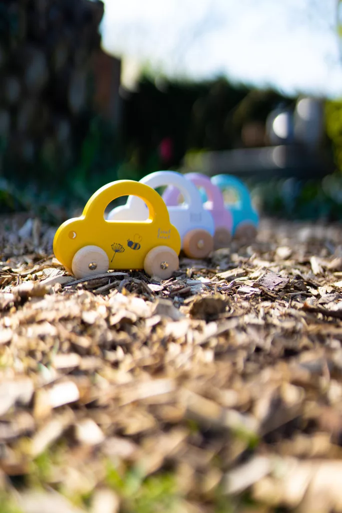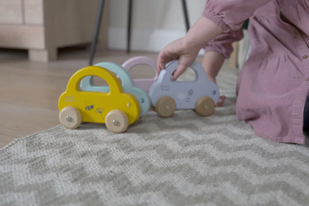 A kisgyermekek könnyedén megfogják az autót a fogantyúnál, hogy azt vezesse, vagy elvigye, ahová csak akarja. Az autó áramvonalas kialakítása, a lágy színek a természetes fa kerekekkel kombinálva tökéletesek a kisgyermek motoros készségeinek serkentésére és fejlesztésére.