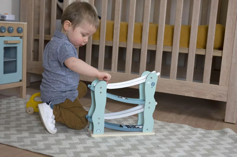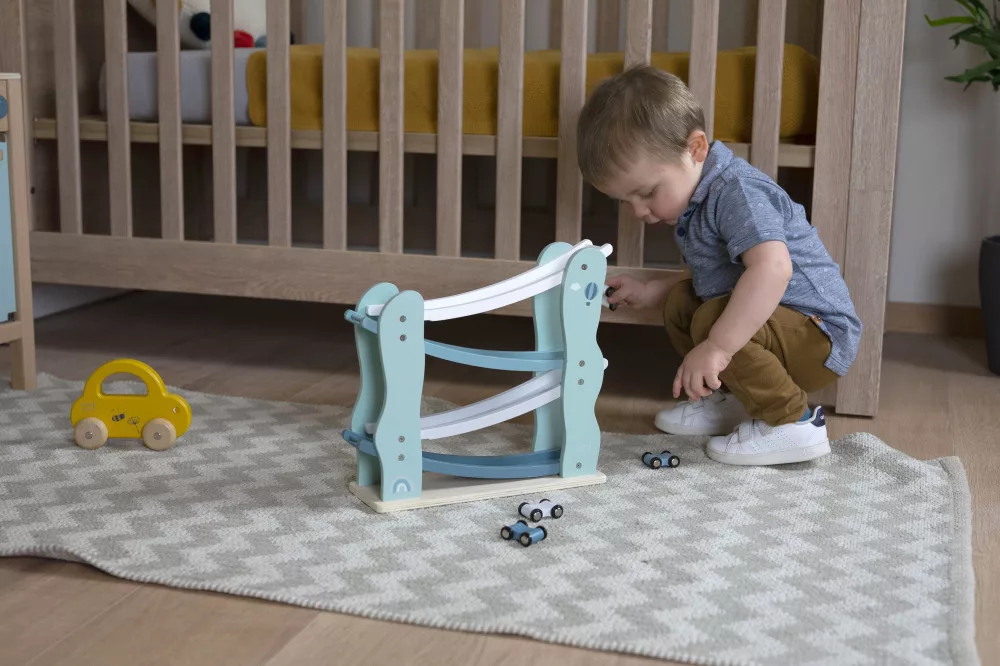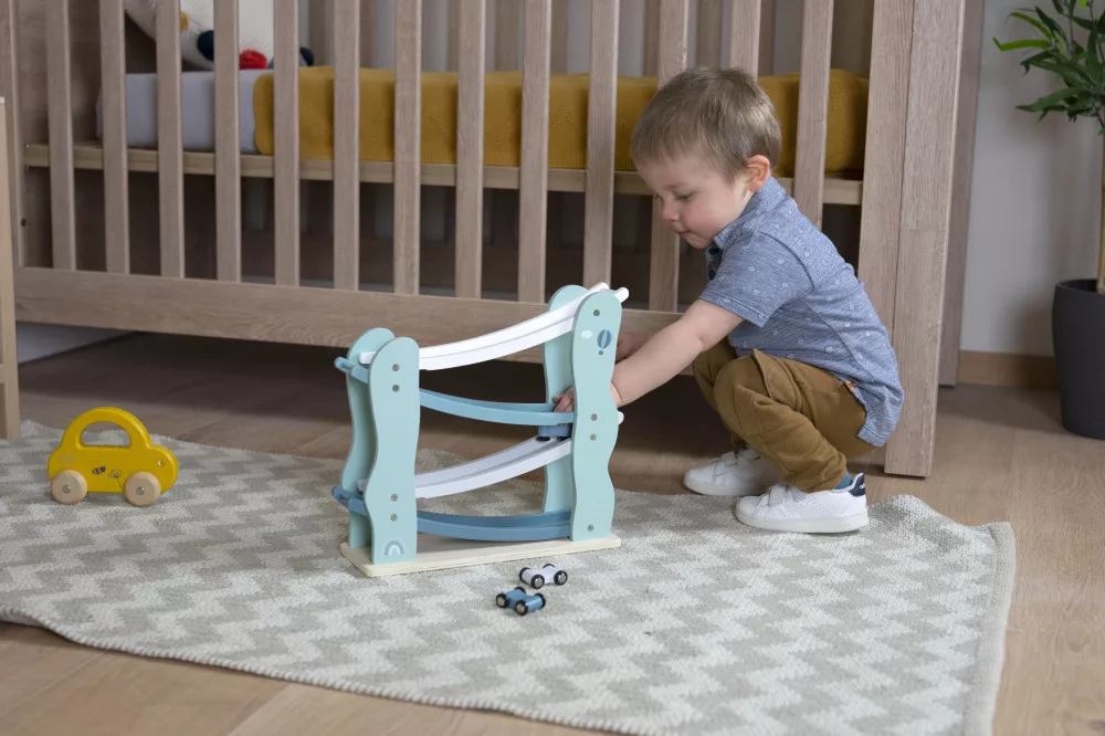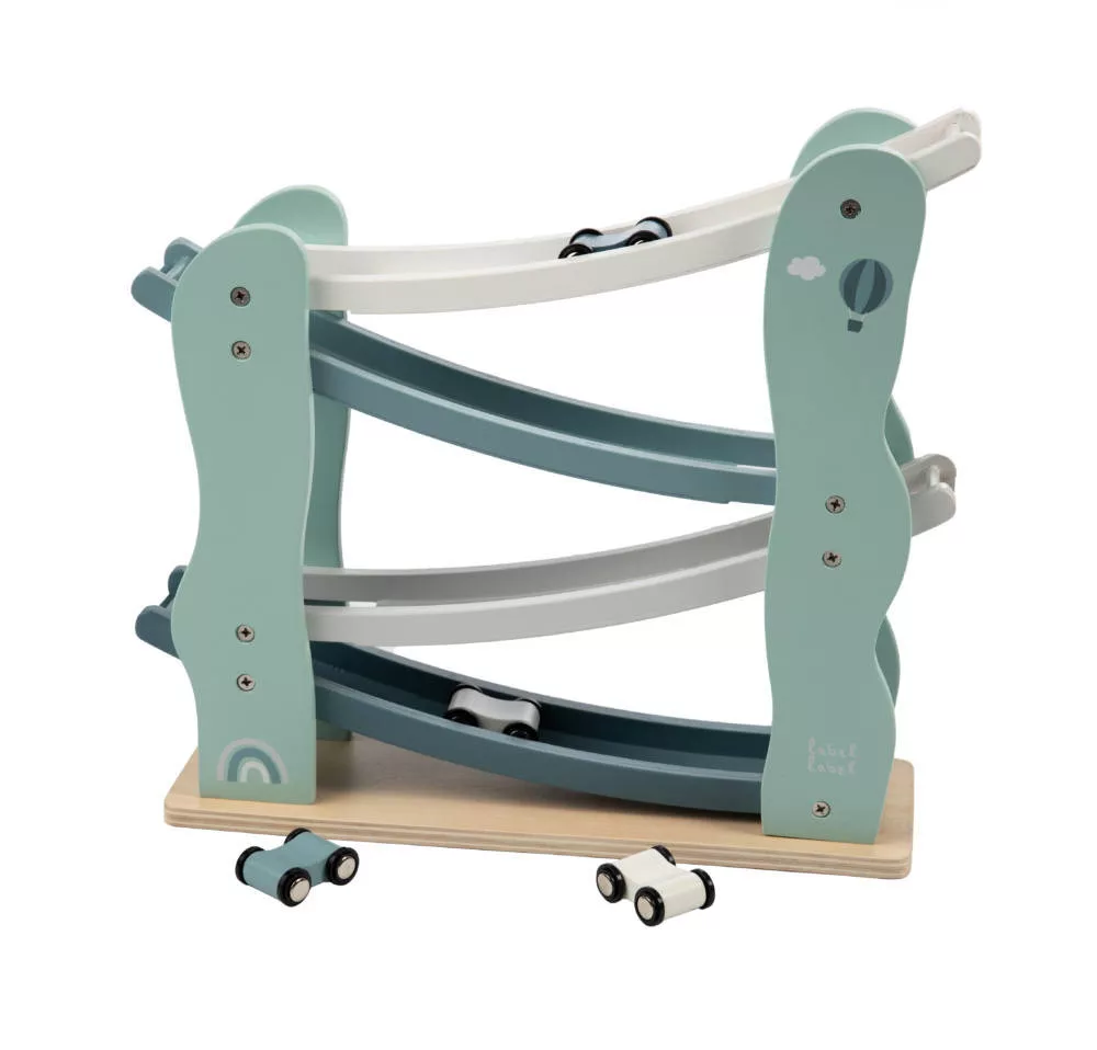 A versenypálya tartalmazza a 4 színes kisautót. A gyönyörű fából készült versenypálya az önfeledt játék mellett, pasztell színei miatt remekül mutat bármelyik gyermekszobában.