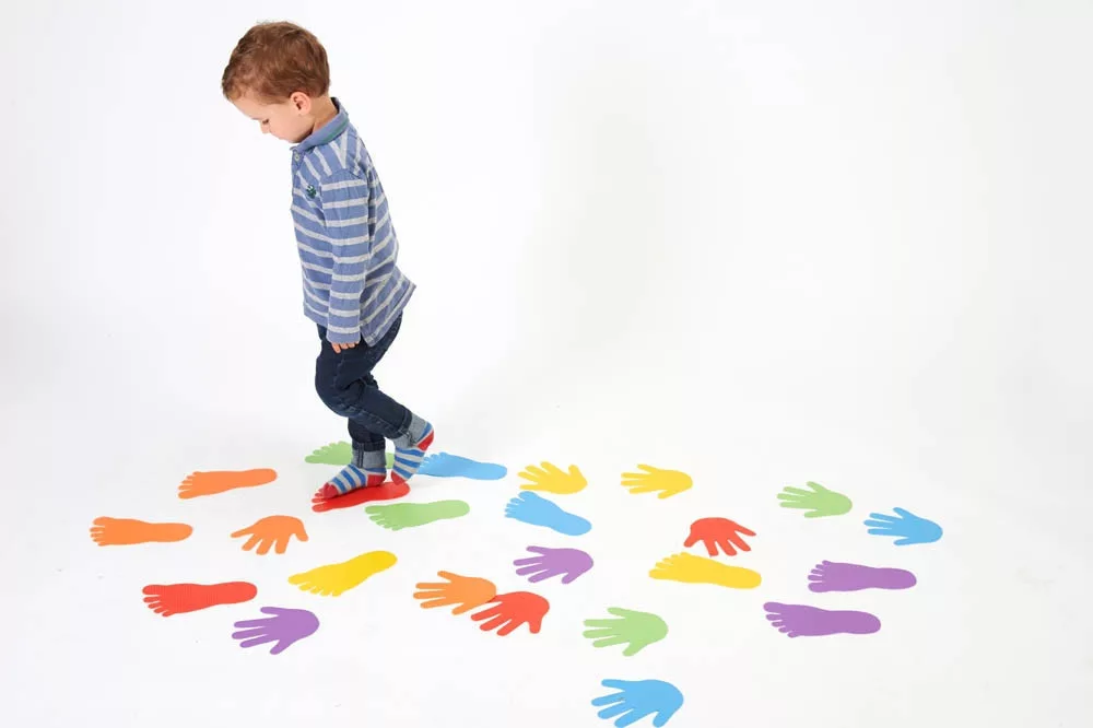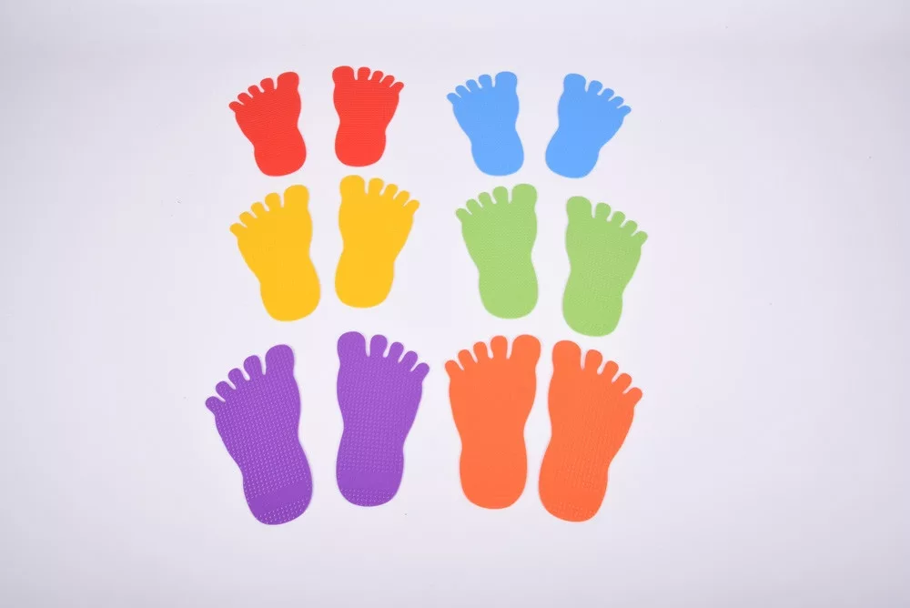 A készlet 6 pár, 12db különböző színű csúszásmentes műanyagból készült lábnyomatot tartalmaz.