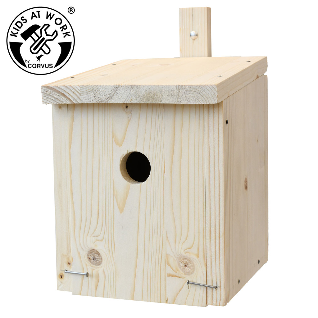 Fészkelő doboz készlet, ragasztott fából, 18 mm vastagsággal. 20 db acélszeggel és 2 db erdészeti szeggel. Az összeszerelés néhány egyszerű kézi tevékenységet igényel (jelölés, fúrás, ragasztás, szögelés). Felnőtt irányításával, részletes szerelési útmutatóval az alapvető munkavégzési ismeretek elsajátítása és a kielégítő sikerélmény megvalósulása. Az építési terv olyan vágáson alapul, amely nem termel fahulladékot. 20 cm-es szabványos tábla kiviteli terve is mellékelve van.