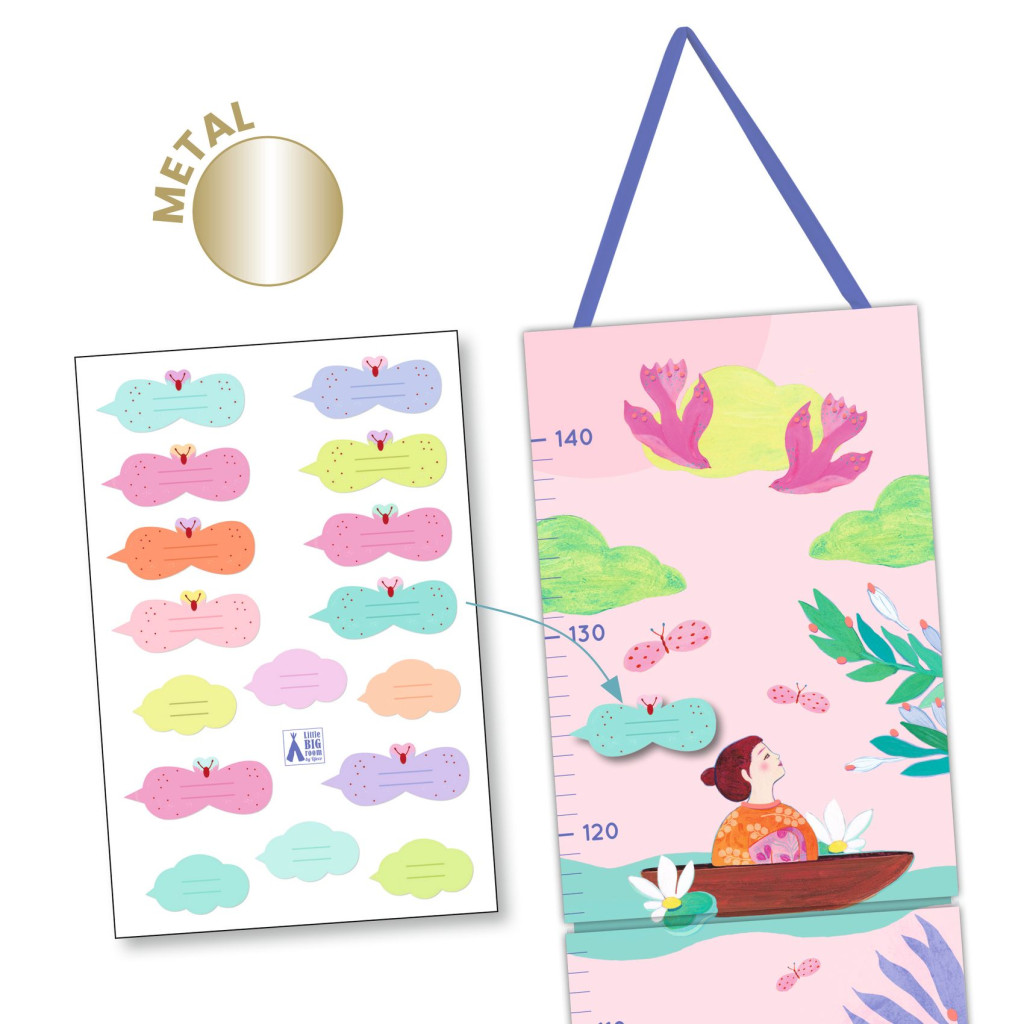 A felhelyezett matricával 140 cm-ig mérhető a gyermek magassága, az áthelyezhető matricákra írható a mérés dátuma.