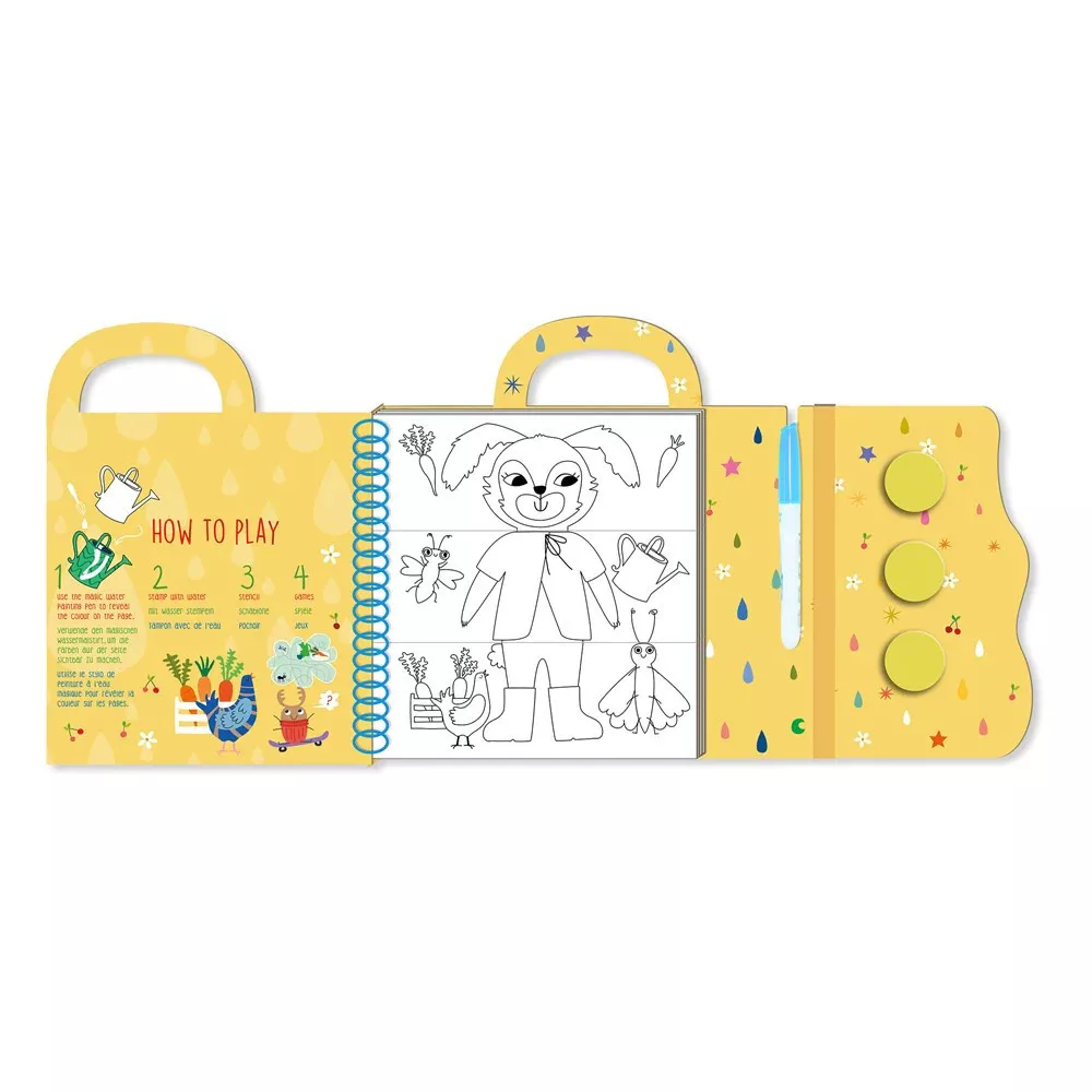 Színezd ki a fehér képeket a vizes ecset segítségével, mely a könyvben található. A játékhoz nem kell festéket használnod! A kép amikor megszárad, visszafehéredik így újra és újra kiszínezheted a "varázstolladdal". Használd a varázs nyomdákat is, melyeket szintén a könyv belsejében találsz.