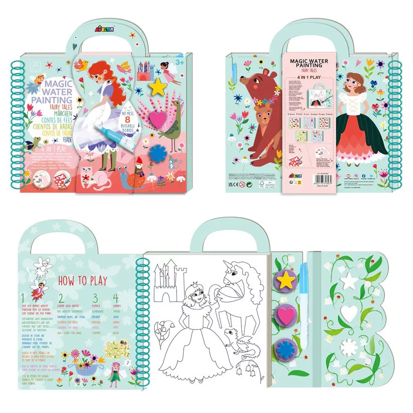 Színezd ki a fehér képeket a vizes ecset segítségével, mely a könyvben található. A játékhoz nem kell festéket használnod! A kép amikor megszárad, visszafehéredik így újra és újra kiszínezheted a "varázstolladdal". Használd a varázs nyomdákat is, melyeket szintén a könyv belsejében találsz.