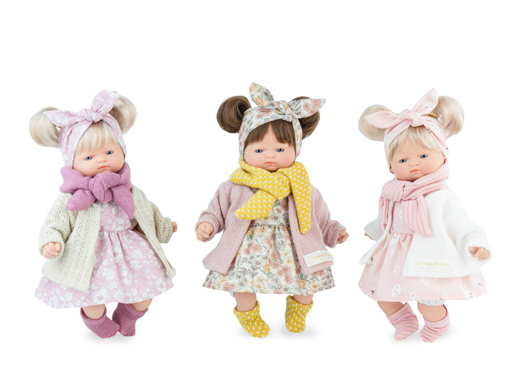 Marina&Pau Kislány színes virágos ruhában és kardigánban, sárga kiszoknival és sállal - 26cm