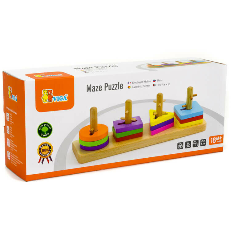 Fából készült formalap színes mértani lapokkal és akadályokkal. Remek készségfejlesztő játék, melynek a lényege felhelyezni, majd levenni a formákat a rudakról, melyeken akadályok találhatóak. Kihívás elé állítja a gyermeket, hiszen gondolkoznia kell a megoldáson. Kiváló szórakozást biztosít a kicsiknek, miközben megtanulhatják a főbb színeket, formákat. Később segít a számok megismerésében és a számolás gyakorlásában játékos módon. Ezen kívül fejleszti a a finommotoros készséget, a szem-kéz koordinációt, térlátást és a koncentrációt. Anyaga: fa
