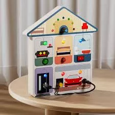 Ez a Montessori házikó tábla fényekkel és kapcsolókkal a kisgyermekek számára tervezett korai tanulási játék. Ideális a 36 hónapos és annál idősebb gyermekek motorikus és érzékszervi képességeinek fejlesztéséhez. A tevékenységtábla kiváló eszköz a kíváncsiság és a problémamegoldás ösztönzésére szórakoztató és biztonságos módon. Ez a játék több interaktív elemmel van felszerelve, amelyek a mindennapi tárgyakat utánozzák.