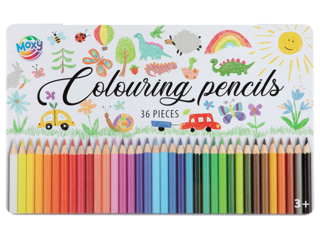 Fém tárolódobozba helyezett 36 db-os színes ceruza készlet, amely élénk és pasztell színeket is tartalmaz.