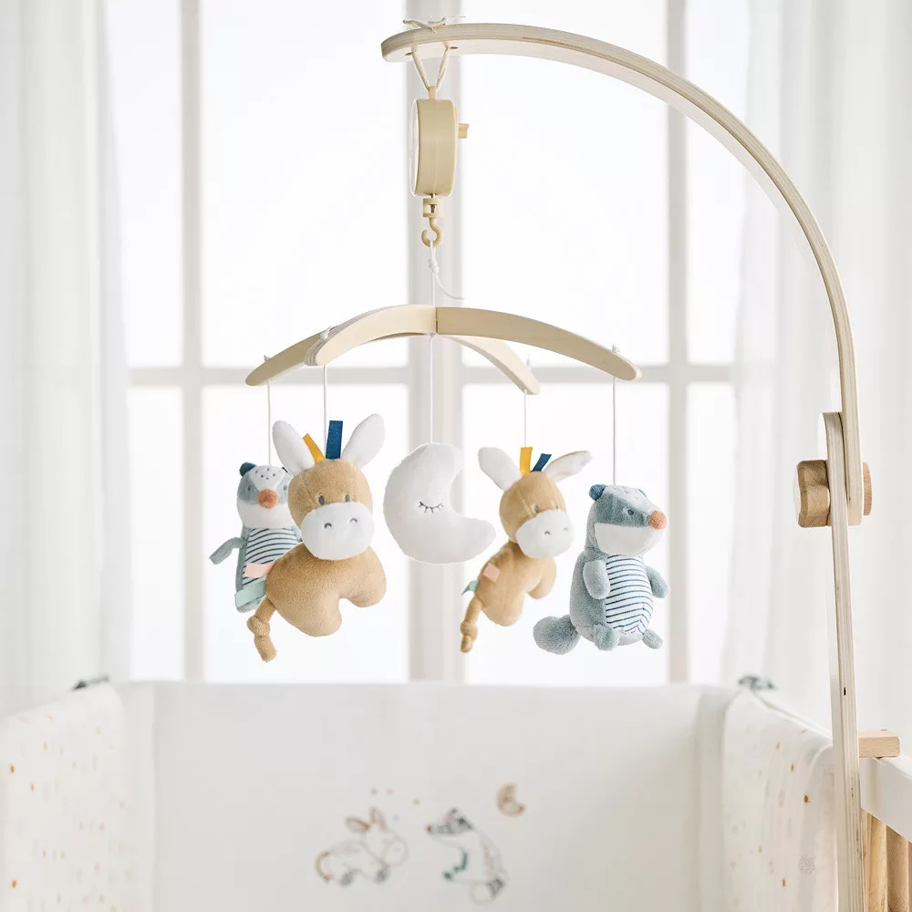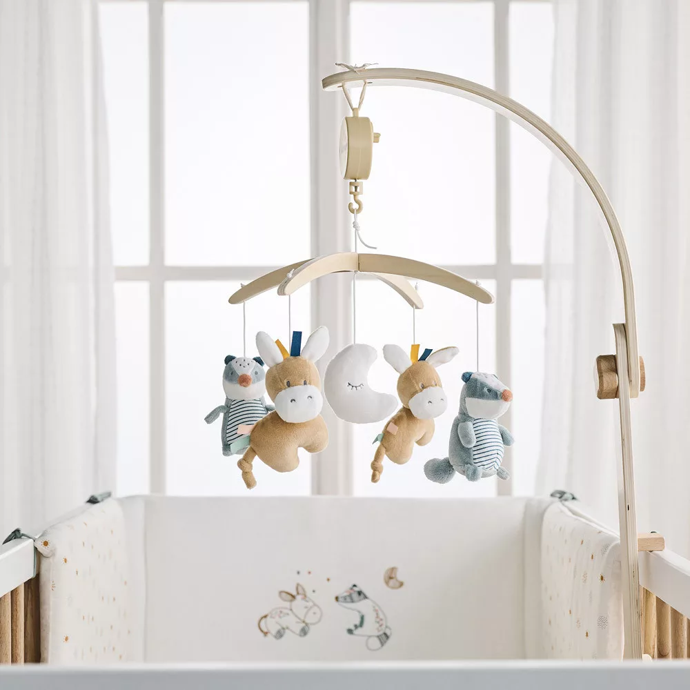 Az imádnivaló zenélõ-forgó, aranyos bújós figuráival – amelyek finoman forognak és mozognak az altatódal ritmusára – nyugodt alvást és édes álmokat biztosít. A zenélõ-forgó egyszerûen és biztonságosan rögzíthetõ a kiságyhoz, bölcsõhöz vagy a járókához, a figurák pedig könnyen eltávolíthatók és mosógépben moshatók.