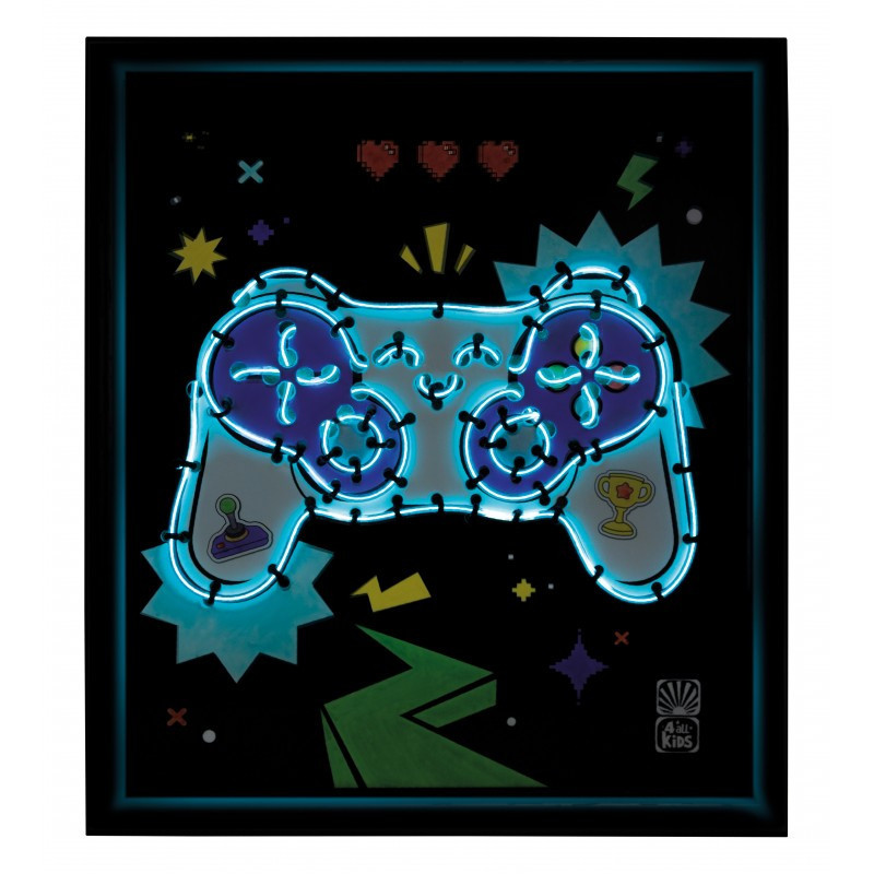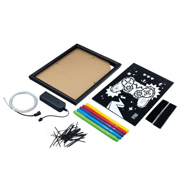 Színezd ki a mellékelt filctollakkal a grafikát, fűzd át a neonvezetéket az ábra szerint és helyezd a képet a keretbe.