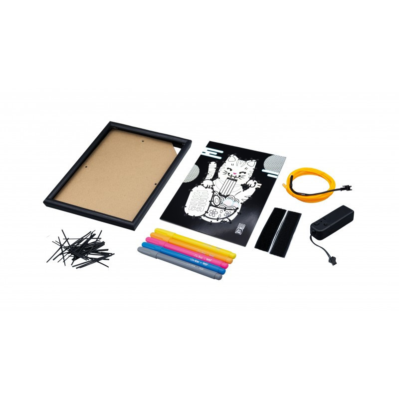 Színezd ki a mellékelt filctollakkal a grafikát, fűzd át a neonvezetéket az ábra szerint és helyezd a képet a keretbe.
