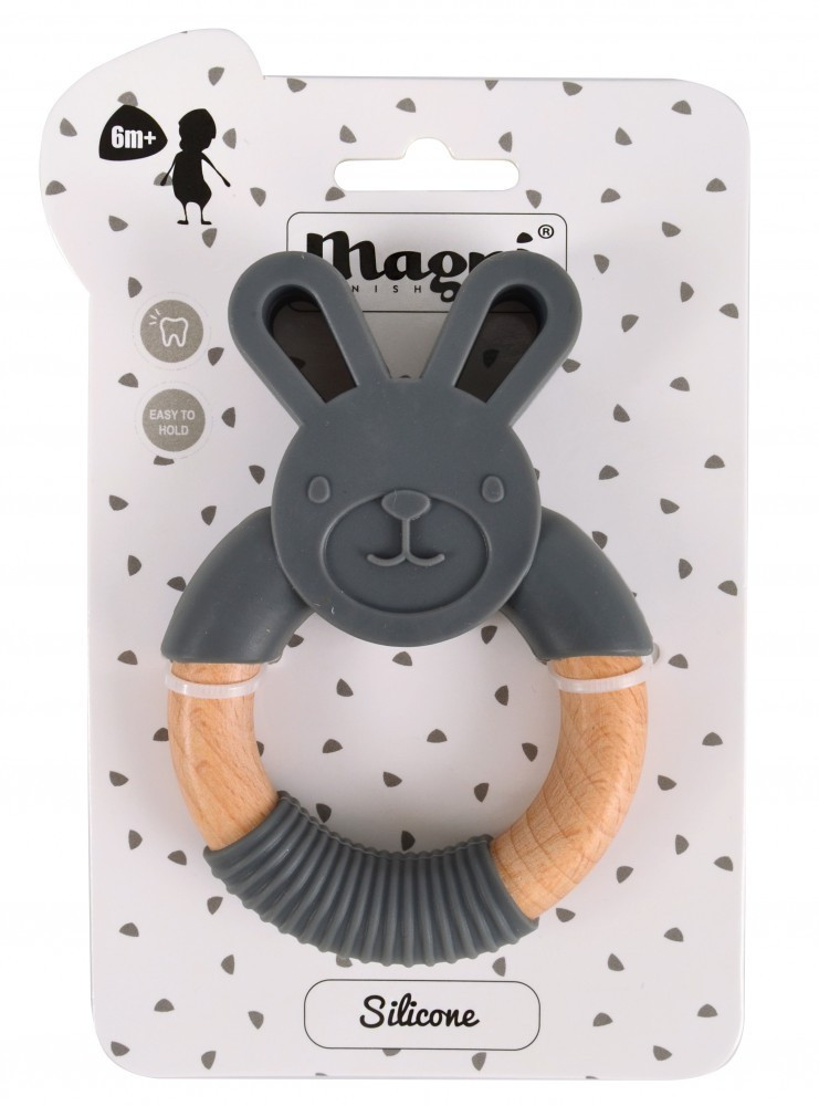 Nyuszis szilikon és fa rágókarika szürke, Magni