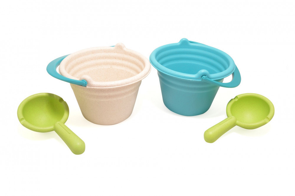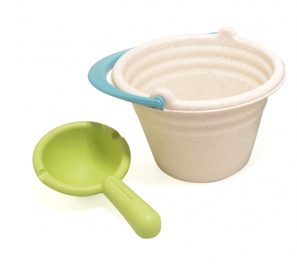 Szerves, lebomló anyagokból készült öko homokozó szett, amely 2 részből, egy vödörből és egy kislapátból áll.