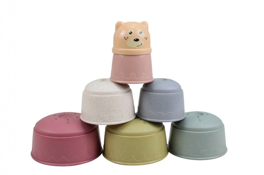 A csomagban 7 db különböző méretű és színű pohárka található, a legkisebb egy kis macifejet ábrázol.