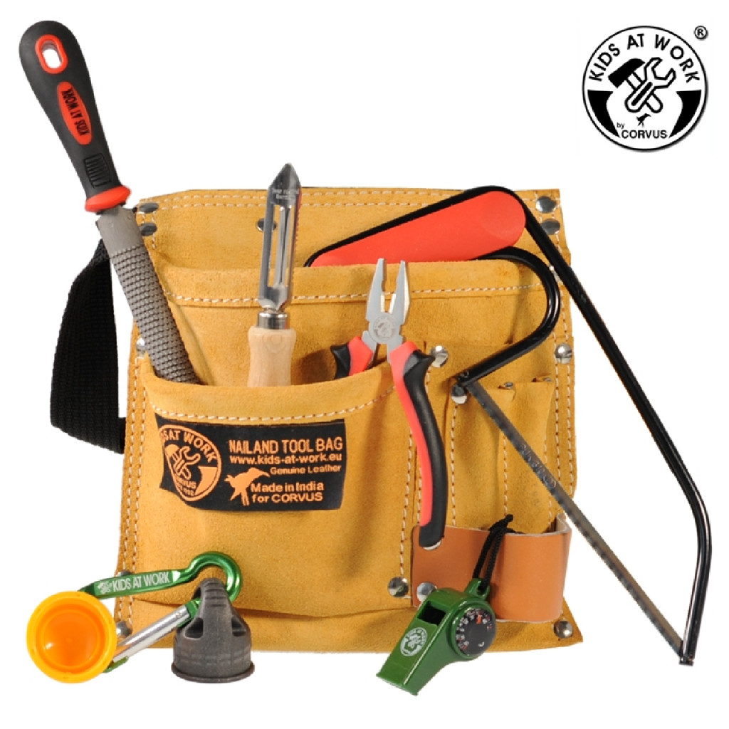 Bőrrel kombinált szerszámtartó öv és a belevaló szerszámok.