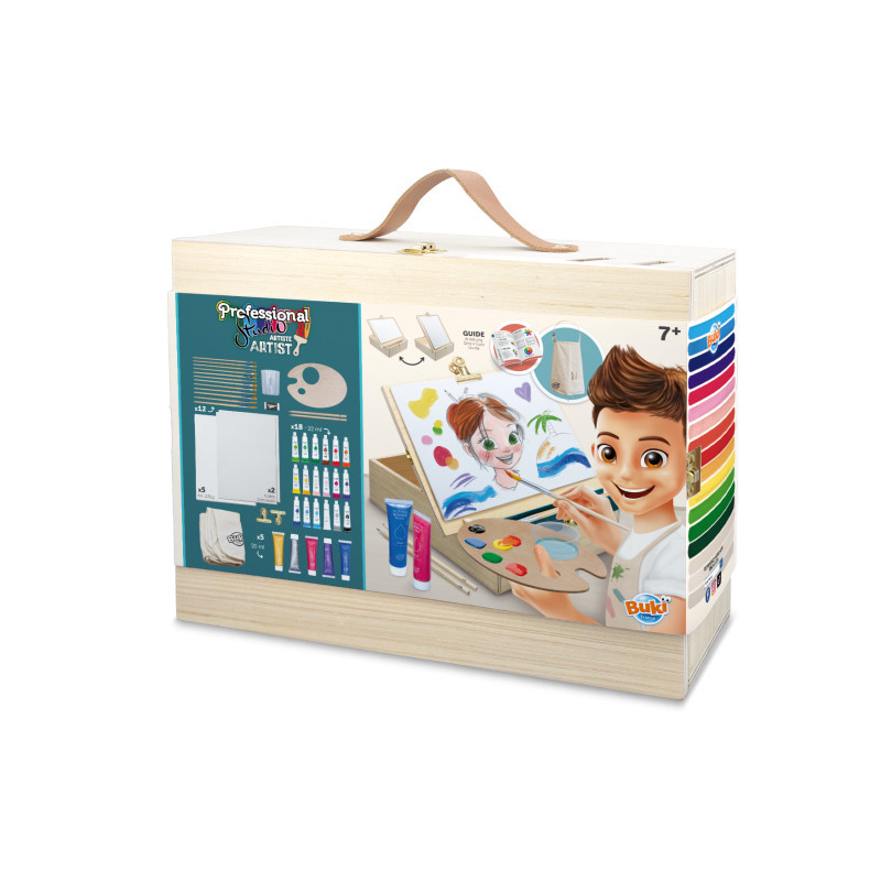 Tartalma: 1 művész kötény, 2 vékony vászon A4-es méretben, 5 lap 230 g-os A4-es papír, 2 db fém kapocs a papírok rögzítéséhez, 12 különböző formájú és méretű ecset, 1 radír, 1 HB ceruza, 1 db 2B-s ceruza, 1 db fa paletta pohárral, 18 db 22 ml-es akrilfestékes tubus és 5 db 20 ml-es csillámfestékes tubus, illusztrál útmutató.