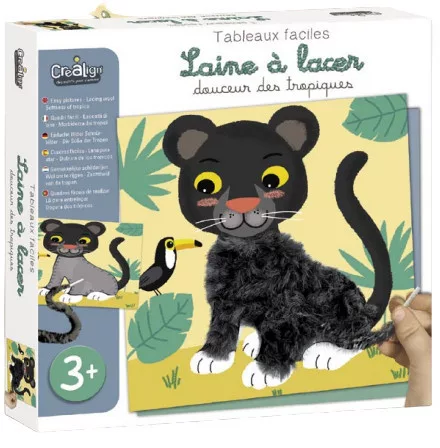 A cipőfűző végű fonalakkal a gyerekek puha bundát készíthetnek az állatos képeknek. Az előre perforált lapok segítenek a finommotorika fejlesztésében és az első, varrást vagy cipőfűzést imitáló mozdulatok megtanulásában. A játékot bármikor elölről lehet kezdeni, hiszen a szálak kihúzhatók, így a színek is cserélgethetők.