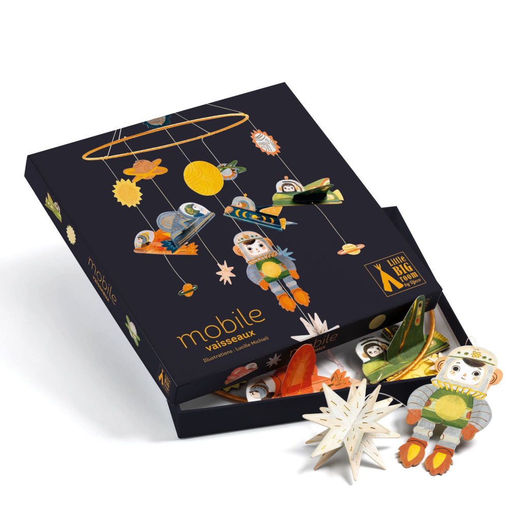 Ez a lágy színű,űrhajókkal, űrhajóssal, bolykókkal díszített szélmobil gyönyörű dekorációs tárgy a gyermekszobában. Már össze van szerelve, csak annyit kell tennie, hogy rögzíti, és csodálja a levegőben repkedő madarakat. A Djeco Mobiles kollekció két világ, a design és az illusztráció költői és légies találkozása. Finom egyensúlyt teremt az álom és a valóság között. Csillogó illusztrációk aranyszínű kiemelésekkel tündökölnek.