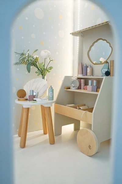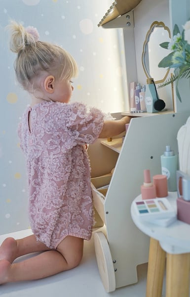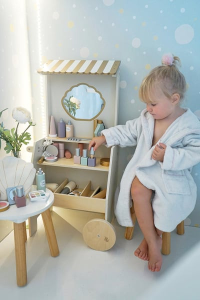 Minden tartozék fából készült a maszatmentes játék érdekében. A szépségszalon kerekekkel és fogantyúkkal rendelkezik, így könnyen mozgatható, a két polcon pedig minden smink- és hajápoló termék tárolható. Összesen 26 különböző luxus tartozékot tartalmaz.