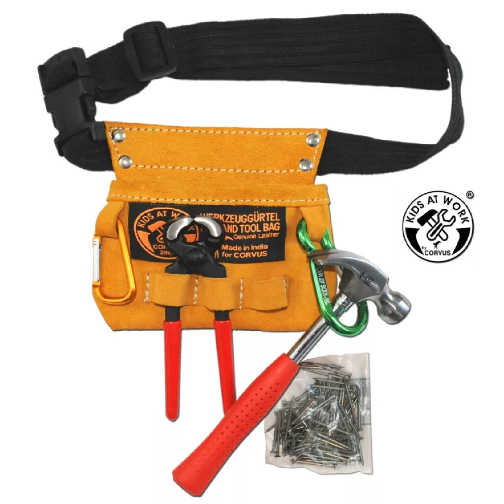 Bőrrel kombinált szerszámtartó öv és a belevaló szerszámok.
