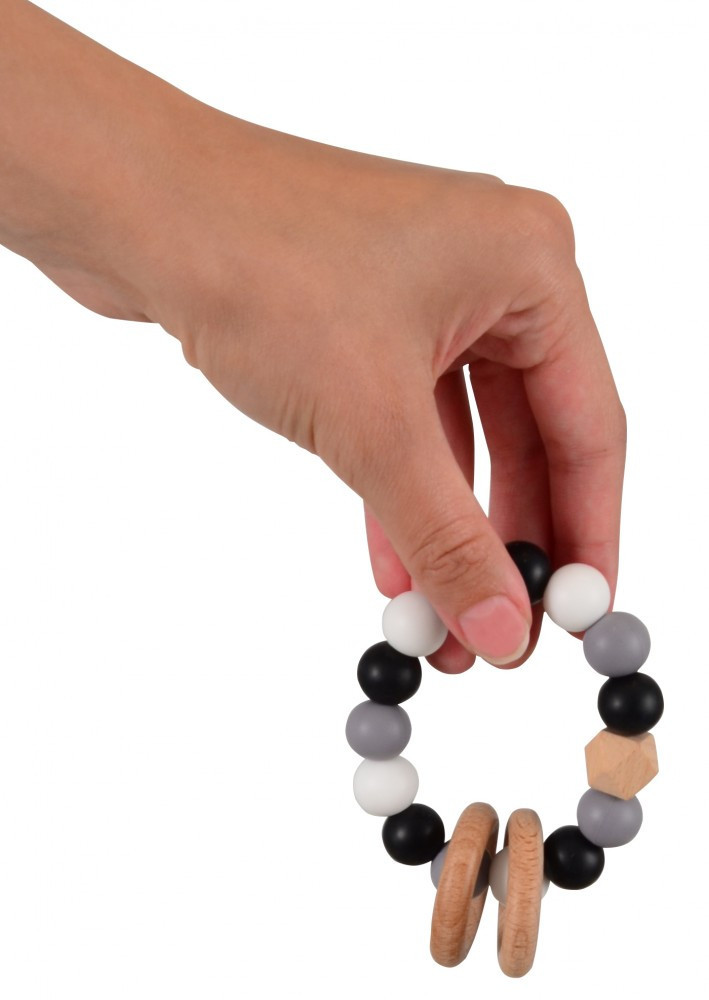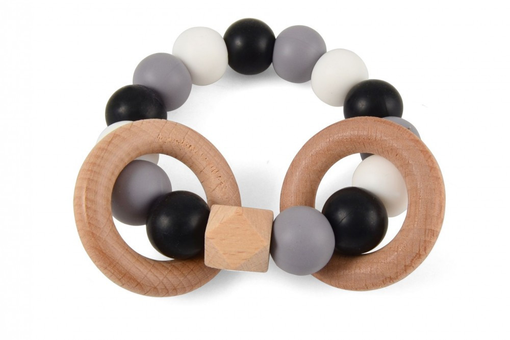 Ez a gyönyörű szilikonból és kezeletlen fából készült rágóka tökéletes játék a baba kis kezeinek. A puha fa és a színes szilikon gyöngyök serkentik a csecsemő látását és mozgását és megnyugtató érzést keltenek a fogzás