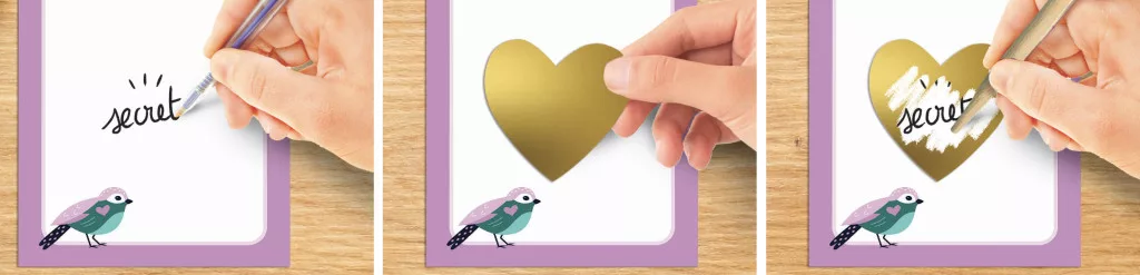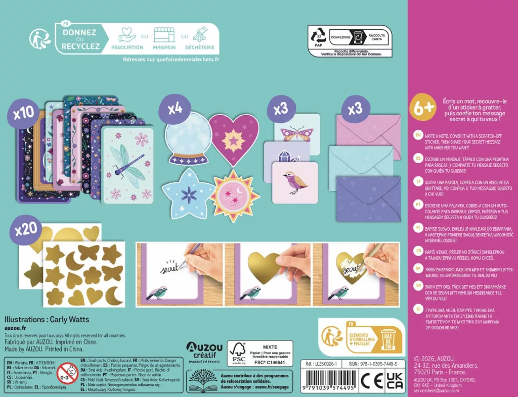 A meseszép mintával ellátott kártyákra titkos üzeneteket írhatsz, melyeket egy lekaparható matricával rejthetsz el a kíváncsi szemek elől. Készíts születésnapi üzeneteket, ajándékísérőt, meghívót vagy bármilyen vicces feliratot amivel szórakoztathatod barátaidat és családtagjaidat. A matricákat csak le kell kaparni, hogy felfedésre kerüljenek a rejtett üzenetek.