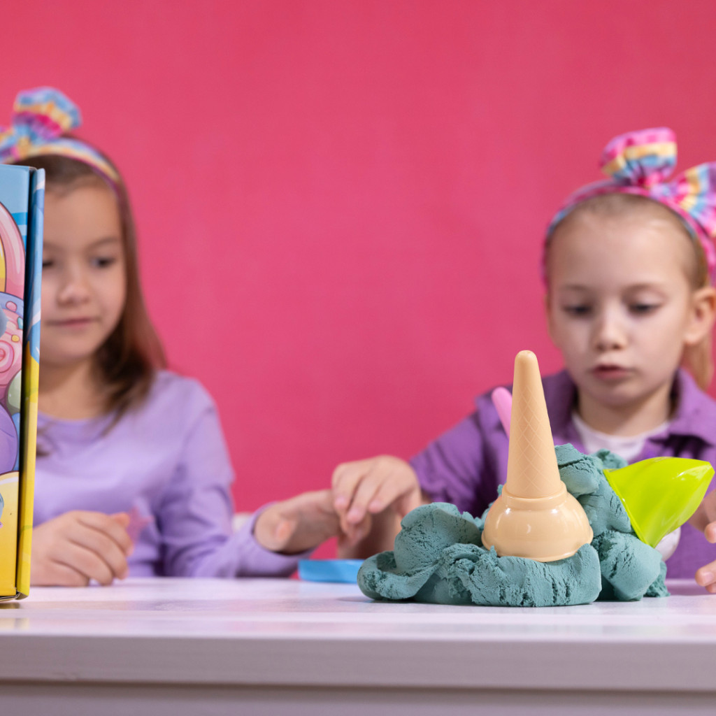 Puha, illatos és ellenállhatatlanul kreatív! A Fluffy Sand fagylaltkészítő szett négy különböző színű, rágógumi illatú kreatív homokot tartalmaz, melyekkel a gyerekek színes és mókás „desszerteket” alkothatnak. A mellékelt fagylalt tölcsér alakú formák és kanál még élvezetesebbé teszik a játékot.