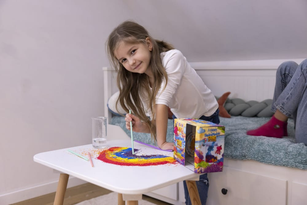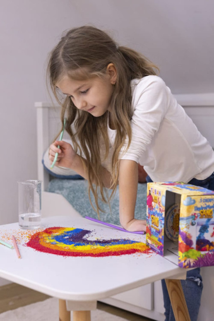 • Színes kreativitás: A készlet 5 különböző színű homokot tartalmaz, így a gyerekek szabadon alkothatnak és kísérletezhetnek.