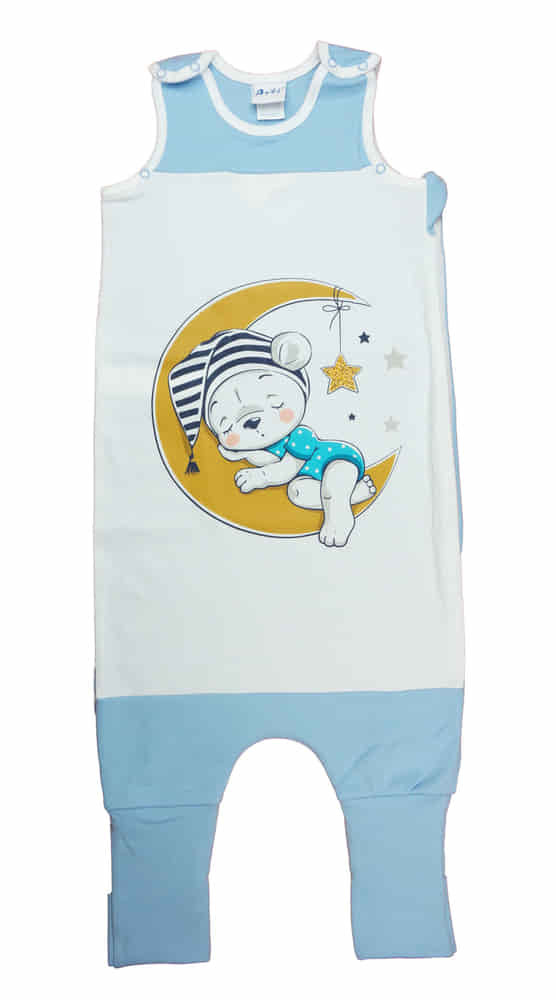 Puha, világoskék színű tipegő hálózsák, amit hold minták díszítenek - tökéletes választás kisbabád éjszakai pihenéséhez. A hálózsák oldalt cipzáras, vállon patentos kialakítású, a lábfejnél pedig egyszerűen ráhúzható, így biztosítva a kényelmes, zavartalan alvást. Az ujjatlan kialakítás lehetővé teszi, hogy baba bármilyen ruhában kényelmesen elaludjon benne, miközben a 1 TOG értékű anyag melegen tartja őt. A 100% pamut anyagból készült hálózsák minőségi, magyar termék, melynek használata bőrbarát, hiszen nikkelmentes patenttal készül, így nem vált ki allergiás reakciót az erre érzékeny babáknál. A hőmérséklettől és időjárástól függően a táblázat segítségével könnyedén kiválaszthatja a megfelelő hálózsákot - így biztos lehet benne, hogy kisbabája mindig a legmegfelelőbb körülmények között pihen.