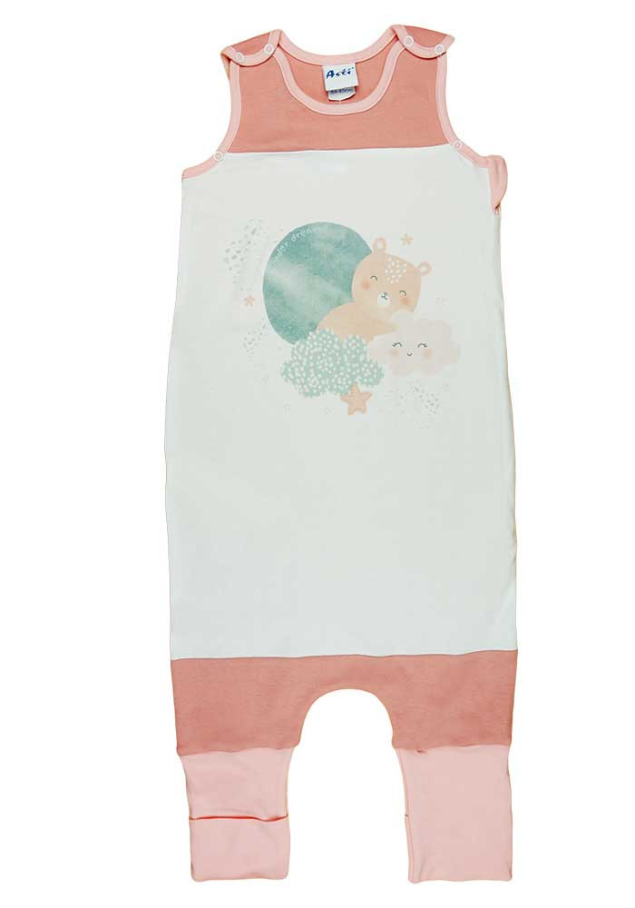 Macis mintával nyomott oldalt cipzáras, vállon patentos, lábfejnél ráhúzható, ujjatlan pamut tipegő hálózsák.