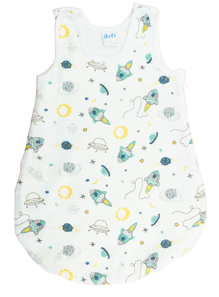Öltöztesse álomba kisbabáját ebben az ürhajó mintás, ujjatlan hálózsákban! Az oldalt cipzáras, vállon patentos kialakításnak köszönhetően könnyedén felvehető és levehető, így az éjszakai pelenkázás sem lesz gond. A hálózsák 100% pamut tetra anyagból készült, ami puha érintésű és légáteresztő, így a baba éjjel-nappal kényelmesen és biztonságosan tud majd aludni. A minőségi magyar termék érzékeny bőrű babák számára is ideális, hiszen nikkelmentes patenttal készült, ami nem vált ki allergiás reakciót. A 1 TOG értékű hálózsák tökéletes választás melegebb hónapokra. Segítünk a választásban: táblázatunk segítségével könnyedén kiválaszthatja a megfelelő hálózsákot az évszaktól és a hőmérséklettől függően.