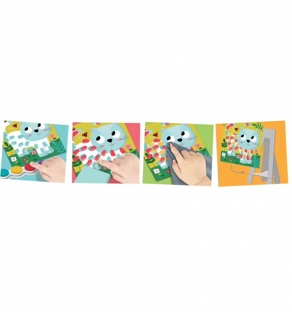 Kiváló készségfejlesztő a kisebb gyermekeknek! A képeket úgy tudják elkészíteni, hogy ecset helyett a saját ujjukat használják és mártják a festékbe. A fóliának köszönhetően a képek nem fognak elkenődni és nagyon szép fantáziadús és egyedi festmények születnek.