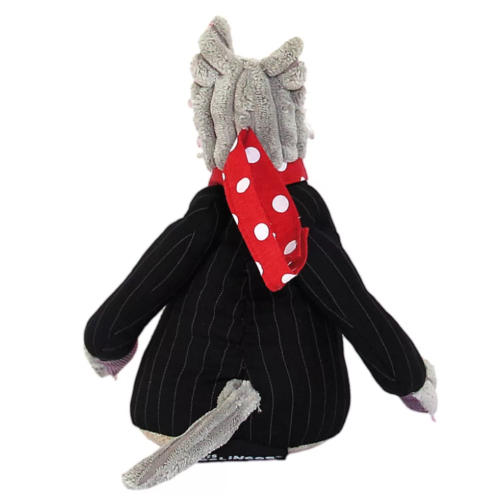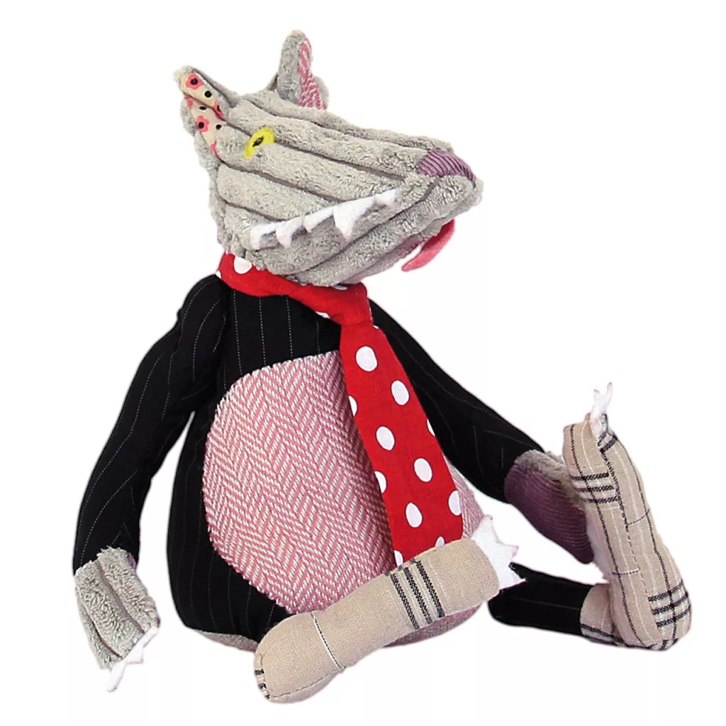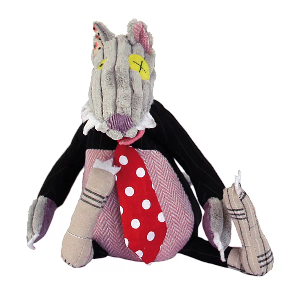 Egyedi tervezésű, bársonyból, textilből készült, saját egyéniséggel rendelkező, zenélő, farkast formázó játékfigura.
