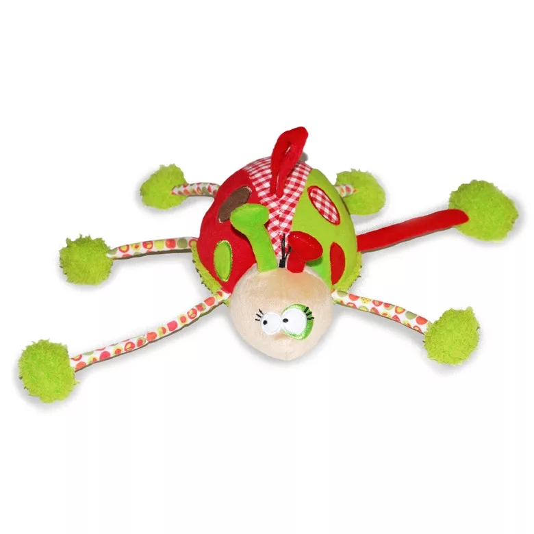 Puha, gyerekbarát, zenélő katicafigura, vidám színekkel, plüssből.
