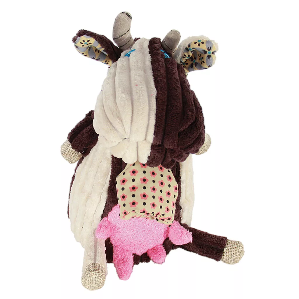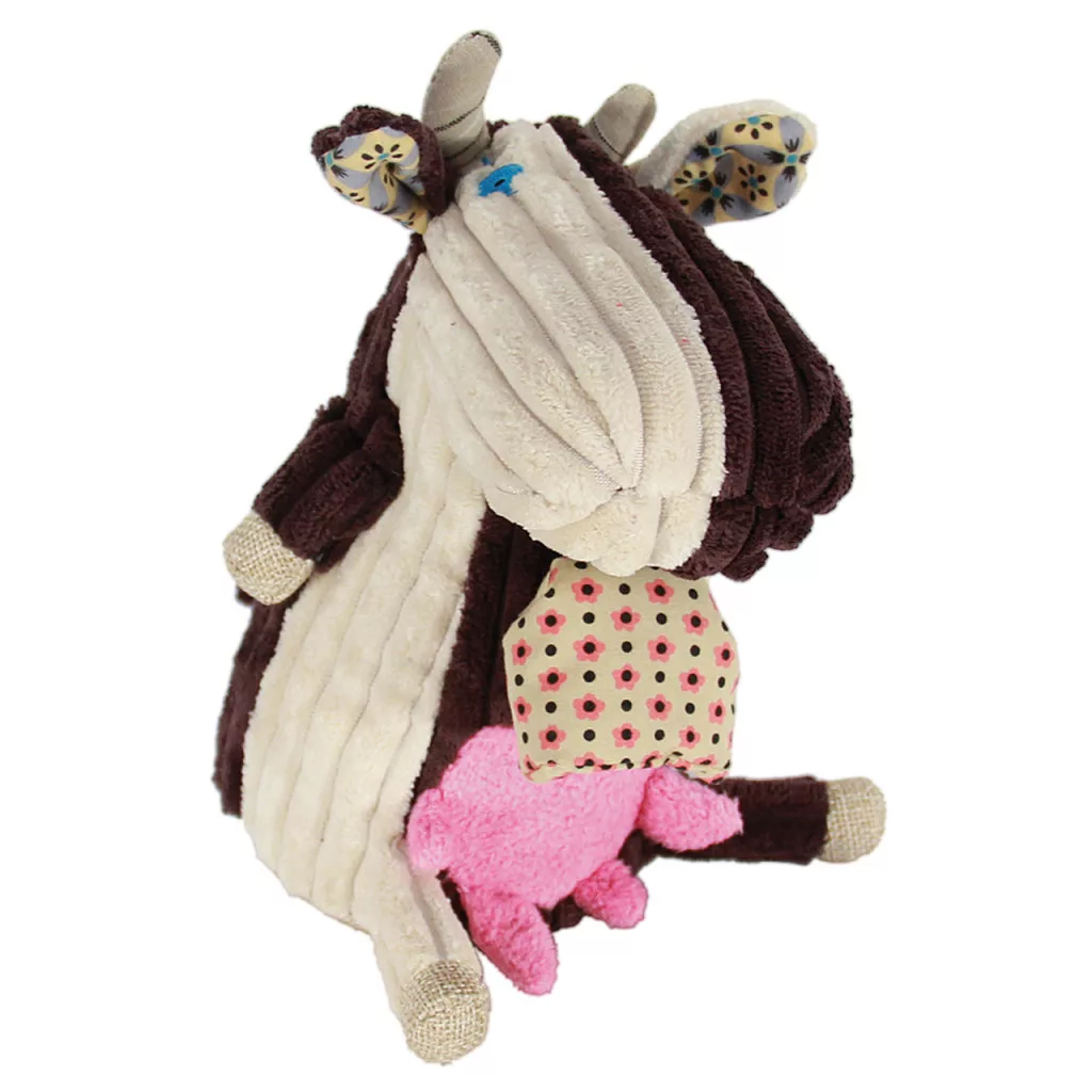 Egyedi tervezésű, bársonyból, textilből készült, saját egyéniséggel rendelkező, zenélő, tehenet formázó játékfigura.
