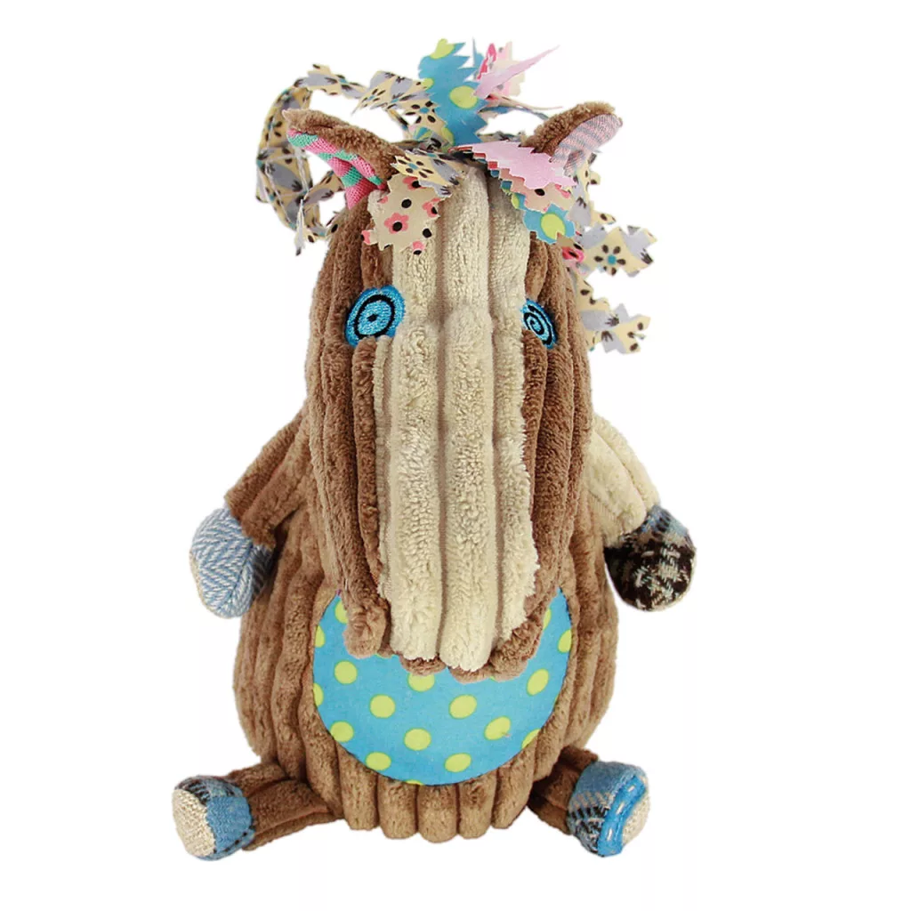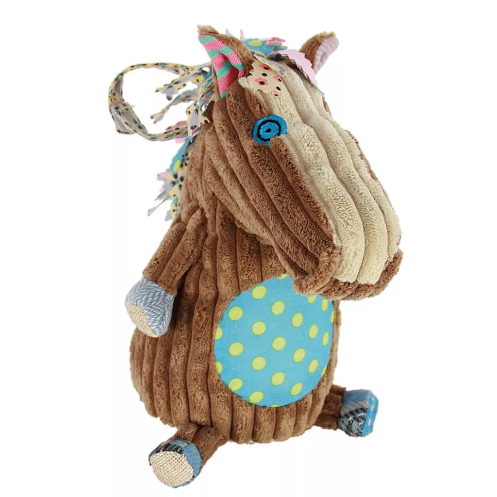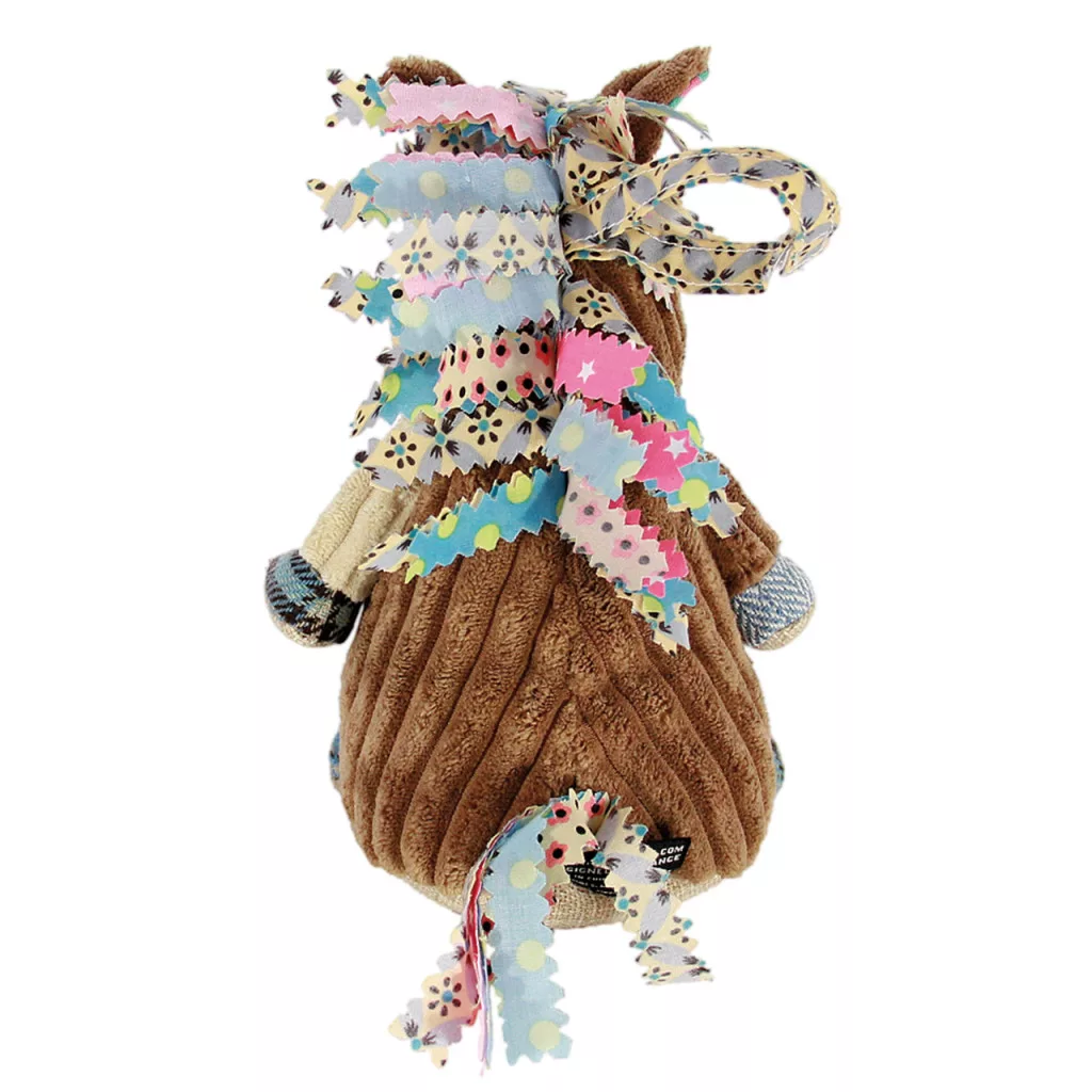 Egyedi tervezésű, bársonyból, textilből készült, saját egyéniséggel rendelkező, zenélő, lovat formázó játékfigura.