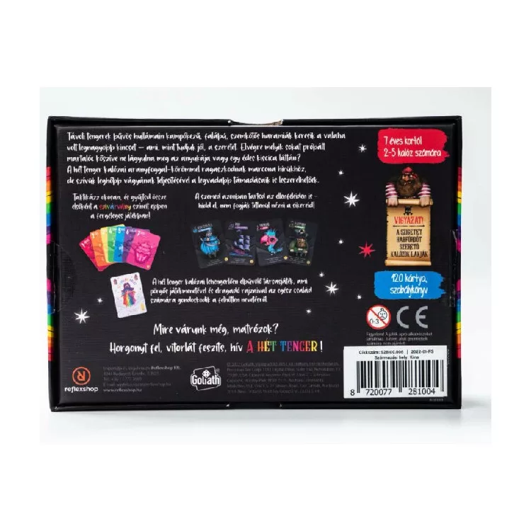 Ahogy a hullámok megtörnek miközben kihajózol a háborgó tengerre, tartsd szem előtt a küldetésed: a szivárvány minden színét gyűjteni - általuk pedig minél több kincsponthoz hozzájutni. De ez így túl egyszerű lenne, nem igaz? Az ellenfeled kezében is ott vannak a különleges lapok, mint például a Rabló - a szívét megbékítette anyuci - aki csak azért lép be a játékba (játssza ki az ellenfeled), hogy ellopjon a szigetedről a saját gyűjteményébe egy kártyát. De ha jól használod az Életelixír kártyát, akkor bármikor visszaszerezhetsz egy értékes kártyát a dobópakliból. Egy körben három akciót kell végrehajtanod. Helyezz le kártyákat a szigetedre, akár szín, akár szám kombinációban. Rendezd át a már ott lévő kártyákat. Utolsóként, pedig lehetőséged van másfajta akcióra, a fekete kártyák, által tudsz lépéselőnybe kerülni. Az ellenfeled körében csak egy dolgot tehetsz - blokkolod a fekete kártyáit! Minden fekete kártyához tartozik egy szín kártya, mint a rablóhoz a piros anyuci, vagy az ágyúhoz a narancssárga cica - mindegyiket a megfelelő színnel tudod blokkolni! A játék kétféleképpen érhet véget: Kijátszottál a kezedből minden lapot és kiraktál két teljes szivárványt - ha ez a kettő teljesült, akkor kihajózhatsz. Nem garantált a győzelem, de 5 bónusz kincspont garantáltan a markodat üti. A másik lehetőség, hogy elfogynak az elérhető kártyák. Minden színkártyáért 1-1 pont jár, míg a bűvös szivárványkalóz 5-5 pontot ér. Vajon melyikőtök stratégiája a nyerő? Tudod blokkolni az ellenfeled kártyáit? A hét tenger kalózai egy innovatív, gyorsan játszható társasjáték megfűszerezve a haramiák mindennapi életével: régi térképek, rablások és borzasztó óriási krakenek. Kalandok, új kikötők és erőteljes rituálék várnak rád. Néhány kalóznak elengedhetetlen, hogy a többiekre támaszkodjon, de ne feledd… bármikor hátba szúrhatnak! A doboz tartalma: 120 kártya szabálykönyv