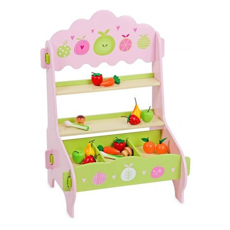 Egy rózsaszín asztali játék eladópult, amely tökéletesen illeszkedik boltos és piacos szerepjátékokhoz. A pult rekeszeiben zamatos gyümölcsök és friss zöldségek várják, hogy gazdára találjanak. A választékban megtalálhatóak: 2 darab eper, 2 darab zöldalma, 2 darab narancs, 2 darab körte, 2 darab póréhagyma, 2 darab paradicsom, 2 darab sárgarépa és 2 darab gomba.