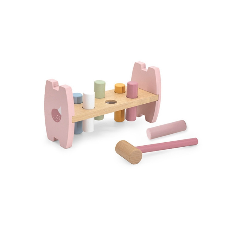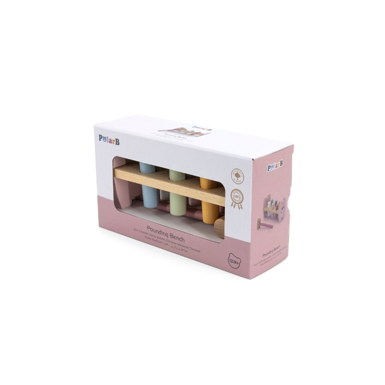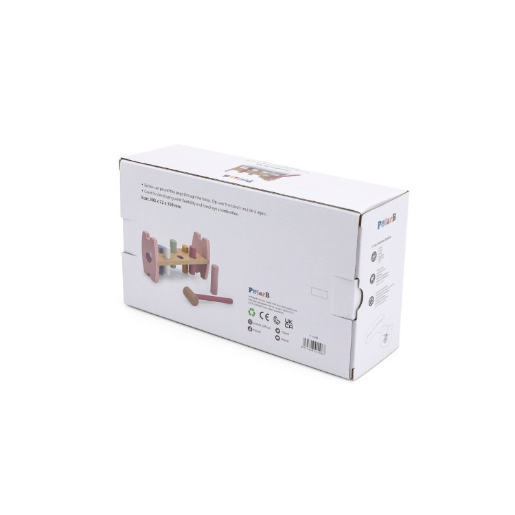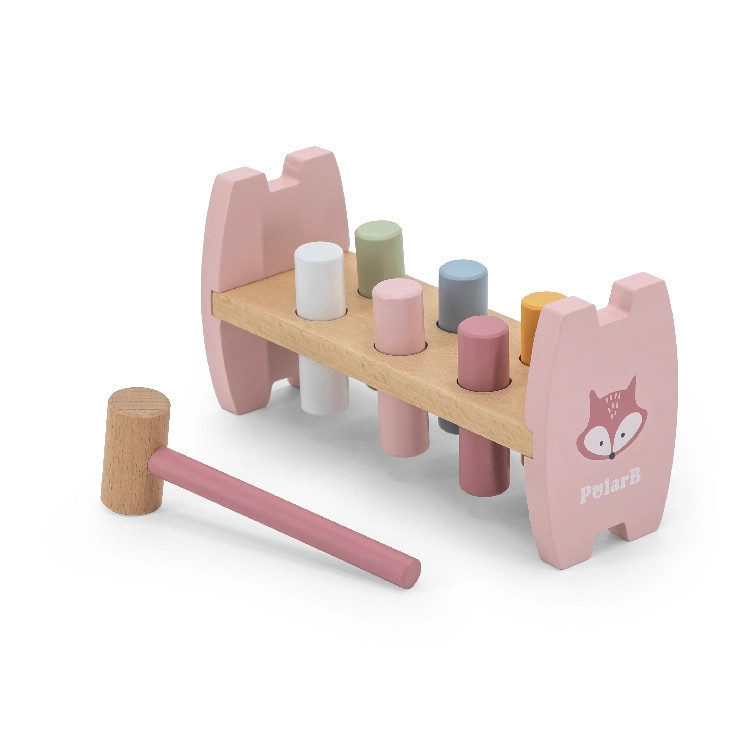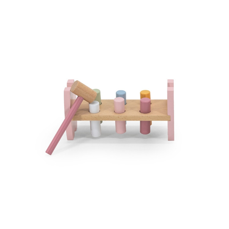 Pasztell színű kalapáló játék fahengerekkel. A mellékelt kalapács segítségével a hengereket kell egyre mélyebbre ütni. Amint minden henger a helyére került a keret megfordításával folytatódhat a móka tovább. Mialatt a gyermekek remekül szórakoznak, fejlődik a finommotorikus képességük és szem-kéz koordinációjuk. Mindezek mellett kiválóan alkalmas a színek és számok játékos elsajátításához.