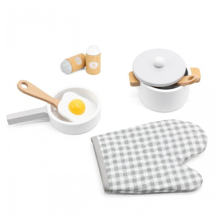 A Viga főzőkészlet egy nagyszerű konyhai készlet gyerekeknek, melynek köszönhetően szórakoztató ételeket készíthet családja és barátai számára. A játék ösztönzi a képzeletet, a kreatív játékot és a szem-kéz koordinációt. A készlet tartalmaz egy fedős edényt, egy serpenyőt tojással, 2 fűszertartót, egy spatulát, egy kanalat és egy sütőkesztyűt.