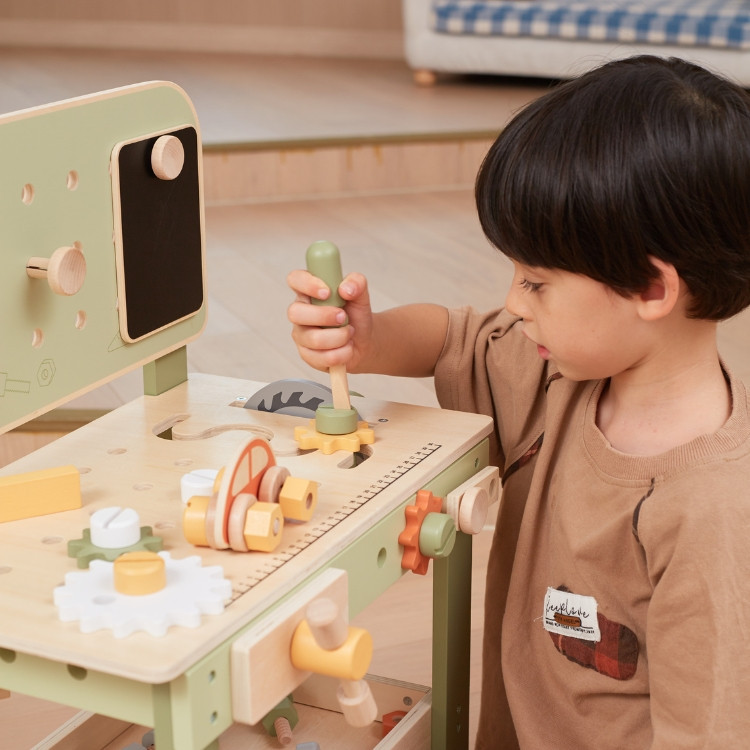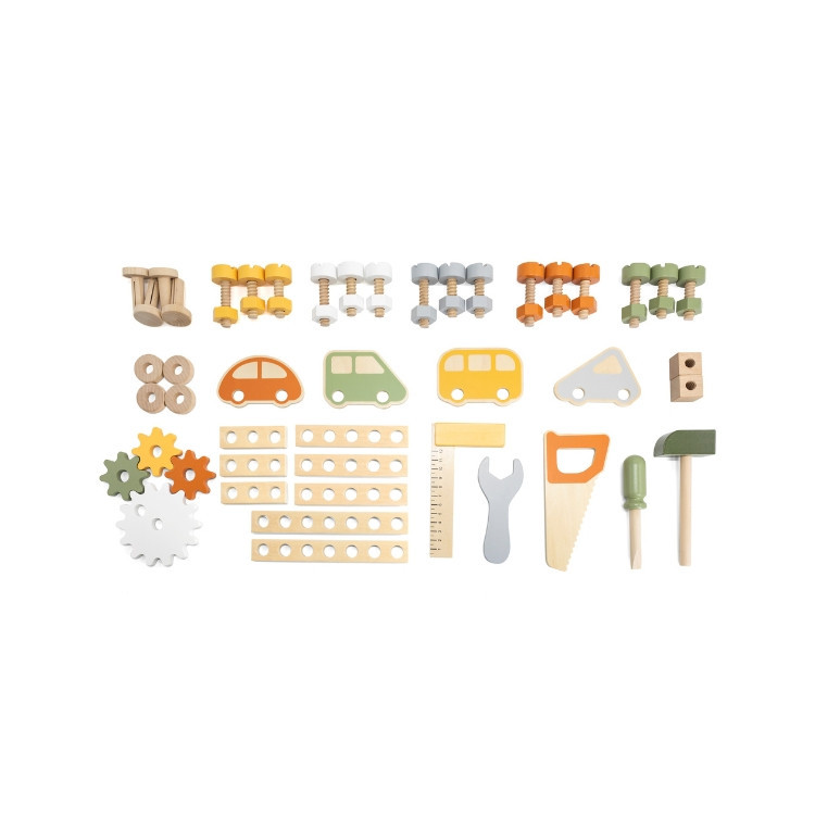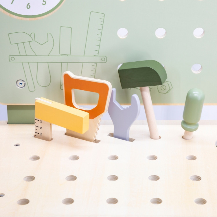 Egy igazi munkapadról nem hiányozhatnak a csavarok, szögek, csavarhúzók, fűrészek, fúrók, és egyéb ezermesteri kellékek! Most a legkisebbek is bepillantást nyerhetnek az építkezés-szerelés folyamataiba. Tökéletes szerepjáték fiúknak, hiszen miközben megismerkednek egy ilyen mindennapi tevékenységgel, közben jól is szórakoznak, és fejlődnek a motorikus készségek is!