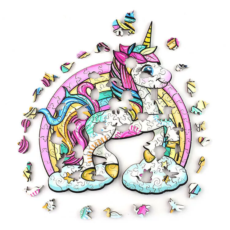 Színes fa puzzle unikornis, mely lézervágott , festett, apró állatfigurákból és növényformákból tevődik össze. Fejleszti a koncentráció, memóriát és kézügyességet. A fiatalabb korosztálytól a legidősebb generációig nagy élményt nyújt az összerakásuk.