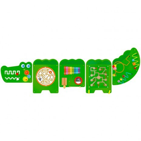 Labirintusos golyóvezető, melyhez csipeszes ujjfogásra van szükség, a krokodil fején kapott helyet, három színes merev drótpályás golyóvezető a krokodil farkánál. A falra szerelhető óriás készségfejlesztő krokodilon számos különböző mókás, játékos foglalkoztató, készségfejlesztő játék található: golyóvezető, fogaskerekek, mágneses golyóvezető, hangszerek és labirintusos játék.