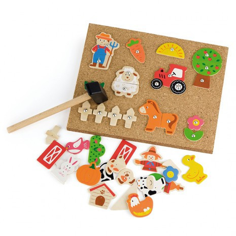 Már a legkisebbek is örömüket lelhetik a különböző elemek, formák, anyagok rögzítésében és végül igazi képpé, montázzsá varázsolásban! Ezentúl az óvodás korosztály számára tökéletesen biztonságos kis szögecskékkel kell a képek egy-egy részleteit felrögzíteni a fa parafa táblára! Ehhez különböző festett fa állatkák, járművek és emberkék részei állnak a gyermek rendelkezésére, amelyek pont a megfelelő helyen vannak átszúrva a sikeresebb és gyorsabb rögzítés érdekében! Az elemek, ha nem épp túl erősen vannak rögzítve, mozgathatók is!